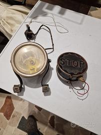 trovati 1 faro anteriore bi-luce diametro 15 centimetri,con il suo devio,nuovo ,colore nero e. ghiera nichelata,fanale posteriore rosso con stritta stop, molato verso l esterno con alcuni segni con scritta BEACON ma molto bello,penso per moto anni 20/30