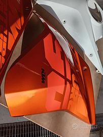 - fiancatina laterale, guscio, carena, cover serbatoio usati: parte arancio sx usata ben conservata 120 euro; parte arancio dx solamente graffiata con attacchi integri 80€; parte bianco opaco tappo serbatoio 70 euro con lieve ammaccatura e sottile crepa.