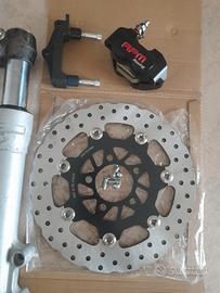 LEGGERE ATTENTAMENTE LA DESCRIZIONE RIPORTATA. KIT FORCELLA IDRAULICA CON IMPIANTO FRENANTE MAGGIORATO PER PIAGGIO NRG MC3. FORCELLA KAJABA REVISIONATA E TUBOLARE DI STERZO PORTATO A MISURA , DISTANZA CUSCINETTO-PERNO RUOTA 410 MM. PERNO ANTI DEFORMAZIONE ANCORAGGIO MANUBRIO. PERNO RUOTA CON RINVIO CONTACHILOMETRI E SPESSORE LATO SINISTRO MODIFICATI. DISCO DA 260 MM FLOTTANTE NUOVO ANCORAGGIO A 5 FORI CON VITI SVASATE. STAFFA PETIT PEST 1 CON APPOSITO SPESSORI E VITI. PINZA RPM NUOVA. PREZZO DEL KIT COMPLETO 450 EURO SPEDIZIONE INCLUSA IN ITALIA. CONTATTARE PRIVATAMENTE SOLO PER CONCLUDERE.