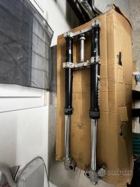Forcelle derivazione husquarna diametro 50, tarate motard. Complete di piedini, piastra superiore ed inferiore ed il loro perno. Sono facili da adattare ad ogni moto, basta farsi fare il perno della ruota. Prezzo leggermente trattabile