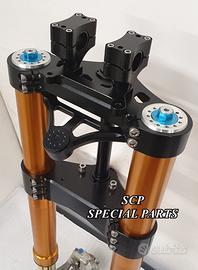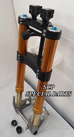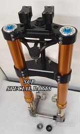Kit costituito da: Forcelle OHLINS allestite SPECIFICATAMENTE. Le forcelle sono corredate da piedini radiali e il kit è completo di impianto frenante radiale BREMBO, piastre di sterzo speciali ricavate dal pieno CON POSSIBILITA' DI REGOLAZIONE OFF SET. Riser ricavati dal pieno con altezza standard regolabili nel diametro e nella altezza. Staffe porta faro e staffe porta quadro strumenti e staffe parafango ricavate dal pieno.