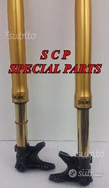 Modifichiamo e realizziamo parti speciali per le forcelle OHLINS di qualsiasi tipo. Oltre alla revisione e anodizzazione delle parti originali ohlins realizziamo piedini radiali RICAVATI DAL PIENO con macchinari a controllo numerico PER TUTTI I MODELLI DI FORCELLE OHLINS. Disponibili con interasse 100 mm o 108mm. Completi di staffe parafango. POTETE TRASFORMARE LA VOSTRA FORCELLA OHLINS DA ASSIALE A RADIALE CON UN ENORME BENEFICIO NELLA FASE DI FRENATA DATO CHE POTRETE UTILIZZARE PINZE RADIALI E UN FANTASTICO MIGLIORAMENTO ESTETICO OPPURE UTILIZZARE PINZE RADIALI DI INTERASSE DIFFERENTE AD ESEMPIO SE LA VOSTRA FORCELLA OHLINS HA I PEDINI RADIALI DA 100mm NOI POSSIAMO REALIZZARNE UNA COPPIA CON INTERASSE DA 108mm E VICEVERSA. Possiamo effettuare particolari lavorazioni meccaniche su richiesta del cliente, al fine di personalizzare al massimo tale realizzazione. Disponibile qualsiasi colore di anodizzazione.
