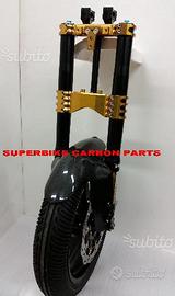 Kit costituito da: Forcelle ohlins, piedini radiali speciali ricavati dal pieno per utilizzare cerchio doppio disco e pinze radiali brembo, piastre di sterzo speciali ricavate dal pieno e sovradimensionate con piastra inferiore da 80 mm a 4 punti di chiusura con cave di alleggerimento passanti e piastra superiore a 2 punti. Riser o semimanubri a richiesta. Possiamo realizzare attacchi o supporti per blocco accensione, amm. di sterzo, blocca sterzo, strumentazioni etc...Tutto il kit è assolutamente plug & play ovvero si monta senza modifiche. Per il montaggio si utilizzano boccole e cuscinetti originali. Tutte le parti ricavate dal pieno possono essere anodizzate di qualsiasi colore. Tutti gli accessori menzionati sono nuovi. Possiamo progettare e realizzare qualsiasi specifica atta a rendere unica tale tipologia di prodotto. Tutte le parti ricavate dal pieno possono essere progettate e realizzate direttamente su specifiche tecniche ed estetiche del cliente. Con i nostri kit potete modificare e/o sostituire l'avantreno di qualsiasi moto e renderla unica. Le forcelle sono appositamente modificate per essere perfettamente compatibili con la moto. Potete utilizzare qualsiasi cerchio, dischi freno e pinze. Il kit può essere realizzato sia per pinze radiali sia per pinze ad attacco assiale o perimetrale (Buell o alcune Harley Davidson). Possiamo fornire come optional: cerchi Oz, Dymag, Pvm, dischi e pinze freno brembo, parafango carbonio, off set regolabile delle piastre. Progettiamo e Realizziamo avantreni speciali per cafe racer, scrambler, streetfighter, superbike, prototipi. Possiamo anche realizzare per qualsiasi moto kit piastre speciali e kit di montaggio (perno ruota , boccole etc) anche per forcelle e cerchi di qualsiasi tipologia, forniti dal cliente.