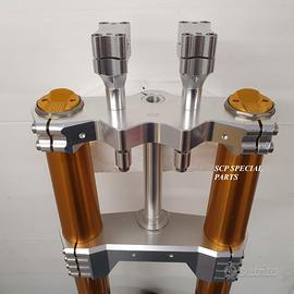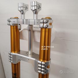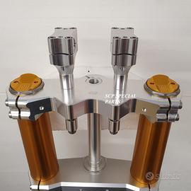 - piastre di sterzo maggiorate su misura ricavate dal pieno con macchinari cnc, realizzate in lega speciale, corredate di tutti gli attacchi originali
