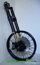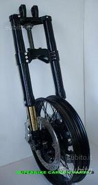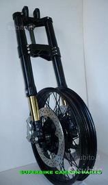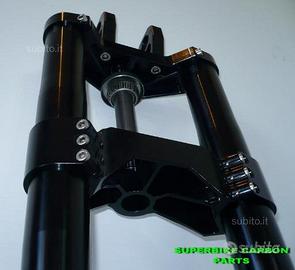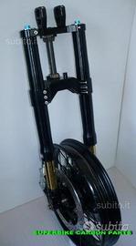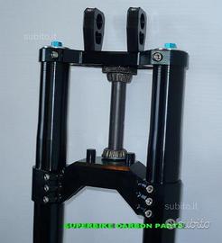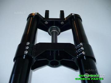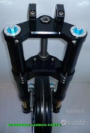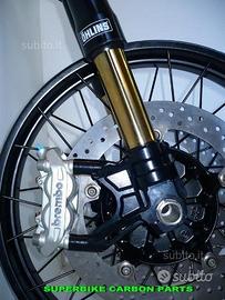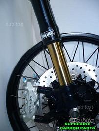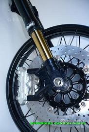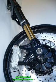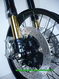 PER BMW K 100 E SIMILI PRODUCIAMO KIT SPECIALE COSTITUITO DA FORCELLE OHLINS, PIASTRE DI STERZO RICAVATE DAL PIENO, PIEDINI FORCELLA RICAVATI DAL PIENO, RAISER MANUBRIO, ASSE CANOTTO, PERNO RUOTA, BOCCOLE CENTRAGGIO RUOTA E PINZE RADIALI BEMBO. Con il nostro kit potete modificare e/o sostituire l'avantreno della vostra moto e renderla unica. Il kit e' costituito da forcelle OHLINS (disponibili sia le Ohlins Road & track 43 che le nuovissime e performanti Ohlins Nix 30), piastre di sterzo speciali ricavate dal pieno, piedini forcella attacco radiale ricavati dal pieno, raiser manubrio in caso di naked oppure semimanubri in caso di moto sportive, pinze freno Brembo ad attacco radiale complete di pastiglie, staffe parafango e parafango in carbonio con perno ruota boccole e distanziali. Progettiamo e realiziamo un avantreno completo di tutte le parti. Le forcelle sono appositamente modificate nell'interasse e nell'idraulica per essere perfettamente compatibili con il tipo di moto. Potete utilizzare qualsiasi cerchi e dischi freno anteriori. Il kit può essere realizzato sia per pinze radiali sia per pinze ad attacco assiale (di cui sono dotate le moto più vecchiotte) o perimetrale (vedi Buell o alcune Harley Devidson). I nostri kit avantreni speciali si montano senza alcun problema e senza dover effettuare alcun adattamento. Tutte le parti ricavate dal pieno le possiamo anodizzare di qualsiasi colore . Anche la forma delle piastre di sterzo possono essere realizzati appositamente su specifiche del cliente. Per il montaggio delle piastre di sterzo si utilizzano boccole e cuscinetti originali. Possiamo realizzare cave di alleggerimento passanti sia sulla piastra di sterzo superiore che inferiore. Predisposizione attacco blocchetto accensione se necessario e attacco ammortizzatore di sterzo eventualmente.Progettiamo e Realizziamo avantreni speciali per qualsiasi moto comprese special e prototipi.