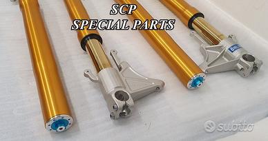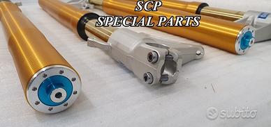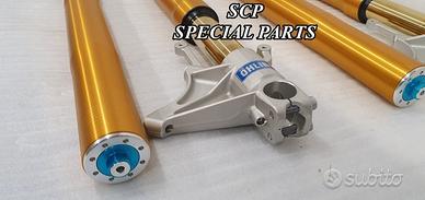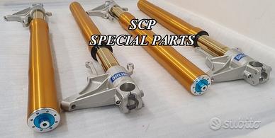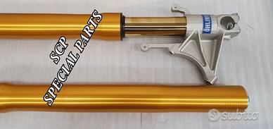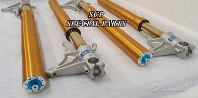 FORCELLE OHLINS STELO ROVESCIATO DA 43mm PIEDINI RADIALI INTERASSE 100mm specifici per moto italiane e bmw (disponibili anche piedini radiali ricavati dal pieno specifici per queste forcelle per avere interasse 108mm come tutte le moto giapponesi) DIAMETRO FODERO SUPERIORE 53mm DIAMETRO FODERO INFERIORE 56mm Possiamo anche prototipare e produrre piastre di sterzo su misura ricavate dal pieno e kit perno ruota su misura per montare queste forcelle su qualsiasi modello di moto.