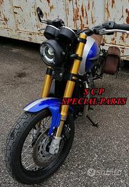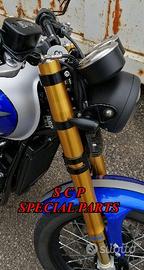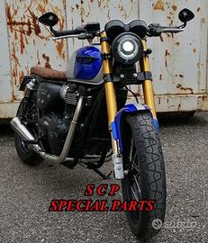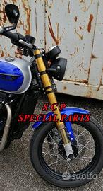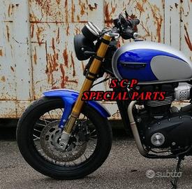 Progettiamo e realizziamo avantreni speciali con forcelle ohlins su misura per: cafe racer, scrambler, streetfighter, superbike, prototipi, show bike, maxi enduro, off road, custom. PRESENTIAMO AVANTRENO COMPLETO PER TRIUMPH BONNEVILLE T 100 2017 / 2019 CON FORCELLE OHLINS, PIASTRE DI STERZO RICAVATE DAL PIENO SU MISURA, STAFFE PORTAFARO E FRECCE RICAVATE DAL PIENO, STAFFA SUPPORTO QUADRO STRUMENTI RICAVATA DAL PIENO. STAFFA SUPPORTO PINZA FRENO RICAVATA DAL PIENO, SUPPORTO SENSORE ABS RICAVATO DAL PIENO E KIT DI MONTAGGIO. SICUREZZA, GUIDABILITA', CONFORT, ESCLUSIVITA' ED ESTETICA AL TOP! TUTTO IL KIT E' PLUG AND PLAY! SI MONTA SENZA NESSUNA MODIFICA UTILIZZANDO CERCHIO, IMPIANTO FRENI E TUTTE SOVRSTRUTTURE ORIGINALI DELLA MOTO. Kit costituito da: FORCELLE OHLINS con stelo da 43 mm, ALLESTITE SPECIFICATAMENTE per T 100. Piastre di sterzo speciali ricavate dal pieno e sovradimensionate con piastra inferiore con alleggerimenti laterali passanti. Piastra di sterzo superiore con alloggio riser originali. Staffa supporto pinza ricavata dal pieno. Staffe parafango ricavate dal pieno con parafango in fibra e kit di montaggio ricavato dal pieno. Staffe supporto ricavate dal pieno per faro originale e frecce originali. staffa supporto sensore abs ricavata dal pieno. Per il montaggio si utilizzano boccole e cuscinetti originali. Tutte le parti ricavate dal pieno possono essere anodizzate di qualsiasi colore. Possiamo progettare e realizzare qualsiasi modifica su richiesta. Sulle piastre possiamo replicare attacchi e supporti originali per telaietto, quadro strumenti, blocco accensione, blocca sterzo, ammortizzatore di sterzo etc oppure possiamo farne di nuovi su richiesta. LO SCOPO DI TALE REALIZZAZIONE E' MIGLIORARE AL MASSIMO LA GUIDABILITA' E LA SICUREZZA DELLA MOTO E RENDERLA UNICA NEL SUO GENERE. Possiamo fornire come optional cerchi a raggi su misura SIA DA 17 CHE DA 18 POLLICI, dischi e pinze brembo, parafango carbonio, piastre con off set regol