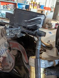 Freno anteriore completo di pompa, tubi, olio, le due pinze e le pastiglie già inserite. L'unico difetto estetico è la vaschetta graffiata come visibile in foto, da riverniciare
