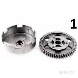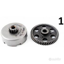 (R.4053) Vendo ingranaggio con campana frizione avviamento a pedali Minarelli V1 P con dentatura elicoidale 15 e 53 e codice Minarelli 710206.7 o 7102067 , codice ingranaggio 40.00717 o 4000717 , pignone con campana 40.0087.7 o 4000877 , disponibili più modelli :