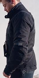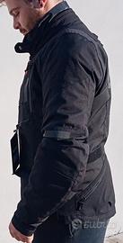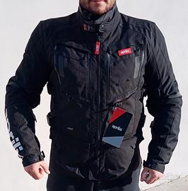 Giacca lunga 4 tasche, ispirata all'avventura Touring. Vestibilità comoda. Tessuto tecnico ad alta resistenza. Prese d'aria regolabili su torace e maniche (pannelli apribili). Fodera termica removibile; membrana impermeabile (removibile e utilizzabile separatamente). Regolabile in vita e maniche, collo regolabile. Bottoni automatici personalizzati Aprilia. Certificazione secondo normativa EN17092 (omologata). Protezioni CE 1621-1 su spalle e gomiti incluse. Predisposizione per paraschiena interno CE (liv.1 o 2) venduto separatamente (protezione torace opzionale). Compatibile con Air Bag. 4 tasche esterne (1 impermeabile); tasche interne su fodera e membrana. Personalizzata con marchio Aprilia.