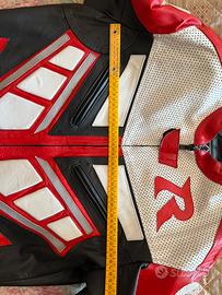 Giacca da moto in vera pelle (prodotta in Veneto, Made in Italy). Dotata di protezioni su gomiti, spalle, addome e schiena (paraschiena estraibile). Tutte le cerniere e il velcro sono funzionanti. Sull’etichetta la taglia indicata è XXL, ma la giacca veste come una XL (fare riferimento alle misure visibili in foto e/o chiedere per ulteriori misure). Sulle parti in pelle bianca sono presenti alcuni segni superficiali. Indossata poche volte.