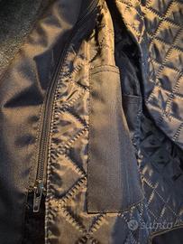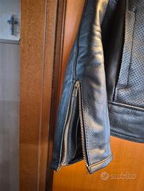 Giacca in pelle, pesante e resistente, sfoderabile e dotata di protezioni su schiena gomiti e spalle.