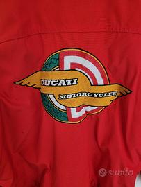 Giubbotto vintage Ducati reverse gruppo Cagiva, usato in ottime condizioni, solo qualche piccola macchia come da foto. Maniche rimovibili con cerniera. Non ha protezioni da moto. Taglia XL, larghezza spalle 55 cm, fianchi 65 cm, lunghezza 70 cm, manica 66 cm.