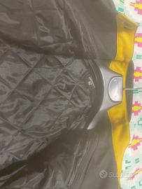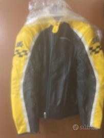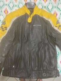 giacca in pelle nera e giallo della Speedy, taglia 52 con imbottitura ai gomiti e ben aderente al corpo , usata poco