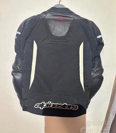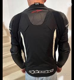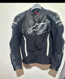 Giacca moto Alpinestars - Taglia 48 • Pelle e tessuto: mix di protezione e comfort. • Sicurezza: protezioni certificate su spalle e gomiti incluse. • Dettagli: cerniera in vita per collegamento ai pantaloni. • Stato: Buono (la pelle bianca presenta segni d'usura, vedi foto).