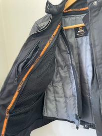 Giacca moto praticamente nuova, usata poco e solo una stagione. Materiale esterno idrorepellente, interno imbottito estraibile tramite cerniera lungo tutta la lunghezza e fissato ai polsini tramite bottoni a pressione. Protezioni a gomiti e spalle facilmente estraibili, finiture in pelle come si vede da foto tasca. Molto comodo e resistente, utilizzabile in più stagioni e temperature.