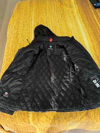 Giacca moto Tucano Urbano taglia 44 L (veste una 42), con protezioni gomiti; interno trapuntato rimovibile ed utilizzabile anche in modo indipendente, doppia chiusura con cerniera e bottoni, cappuccio rimovibile, 5 tasche, polsini regolabili con velcro, linea femminile leggermente sciancrata; colore grigio antracite. Adatta anche in città per scooter