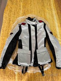 Ottima giacca da moto 4 stagioni per donna; taglia M (42/44) fit for lady; colore grigio chiaro e nero; giacca a 3 strati, doppio interno rimovibile: 1 antivento utilizzabile anche singolarmente ed uno trapuntato per le temperature più fredde; protezione spalle e gomiti, tasca per paraschiena; colletto, braccia, polsini vita e fianchi regolabili; 2 prese d'aria anteriori, 2 sulle braccia e 2 posteriori; chiusura anteriore con cerniera e bottoni automatici; elastici da far passare sotto le cosce per non far entrare vento nella schiena