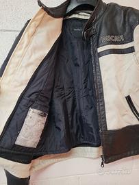 Giacca da moto Ducati taglia L in tessuto misto pelle, con protezioni su spalle e gomiti, fodera termica interna rimovibile.