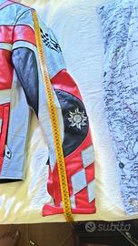 In pelle con protezioni morbide spalle e gomiti. con logo Max Biaggi. Taglia 52. Usata 2 volte, in ottime condizioni, pari al nuovo.