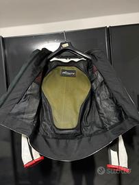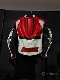 Giacca in pelle, tg 46, con para schiena integrato, protezioni spalle gomiti e gobba, slider in titanio spalle e gomiti, interamente fatta a mano, il nome sul retro è scucibile.