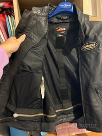 Giacca moto spidi in pelle con protezioni spalle e gomiti,trapuntino interno, cerniera per attaccare un pantalone. Due tasche interne ,inserti elastici dietro ,cerniera sui polsi con bottoni. Nuovo mai messo me lo hanno regalato ma io porto una taglia in più.Nuovo senza cartellino mai usato .