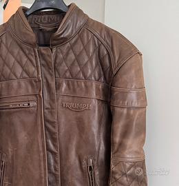 Vendo giacca moto Triumph in pelle stile cafe racer tg. S, condizioni ottime. La giacca comprende uno smanicato gr. 100, agganciato tramite cerniera, con possibilita di rimuoverlo. Protezioni spalle e gomiti incluse e removibili. Preferibile ritiro a mano.