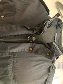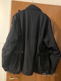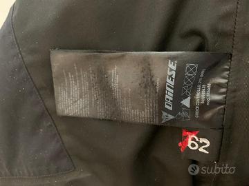 giacca Dainese, color nero taglia 62, con più tasche, tessuto Cordura, lacci con velcro sulla vita per restringerla. Ha un piccolo foro di sigaretta sul davanti per il resto è perfetta.
