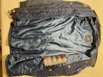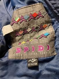 Giacca impermeabile vintage anni ‘90 marca Spidi, interno in pile staccabile ed utilizzabile anche autonomamente, colore blu, pile in verde. Chiusura con cerniera YKK ed automatici Fiocchi con patta antivento. Colletto in velluto, chiusura polsi regolabile con automatici, due ampie tasche a soffietto esterne con chiusura con automatici, una Interna con chiusura in velcro. Restringibile un vita con cintura regolabile con velcro. No protezioni. Molto calda in ottime condizioni.