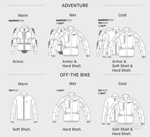 Soft Shell. La giacca termica dotata di tecnologia Comforce. Lo strato intermedio è un soft shell costruito con mix di materiali elastici e frangivento WindOut. Può essere agganciato tramite zip e loop sia all’Armor che allo strato esterno, oppure indossato indipendentemente, come capo outdoor una volta scesi dalla moto.