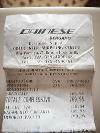 Vendo giubbotto Dainese 4 stagioni, in Goretex mai usato per taglia troppo piccola. Tasca cargo lato posteriore, tasche esterne con velcro e cerniera, giacca termica interna removibile e utilizzabile separatamente. Tessuto riflettente in Goretex. Gancio per collo, sistema di accoppiamento con pantaloni, maniche regolabili, cintura in vita regolabile, sistema di areazione anteriore e posteriore. Polsi regolabili. Taglia 58. completo di tutte le protezioni. Mai usato