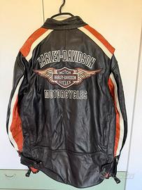 Giubbotto Harley Davidson originale nero, bianco e arancione, in vera pelle made in Italy taglia L. Usato ma tenuto bene, normali segni di usura come da foto.