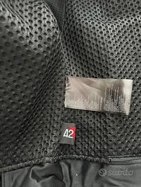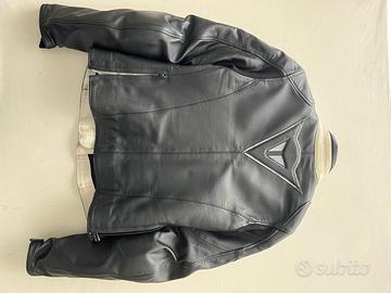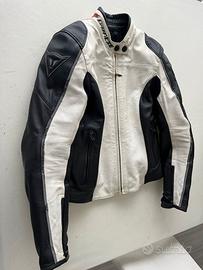 Vendo giubbotto moto donna Dainese in pelle nero-bianco tg. 42. Il giubbino include protezioni per spalle e gomiti.