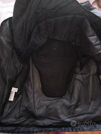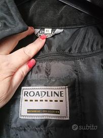 Giubbotto moto ROADLINE uomo, colore nero, taglia XL, misura spalle 52,5 cm, da ascella ad ascella 64 cm, lunghezza 74 cm. Fornito di protezioni ( schiena - spalle - gomiti) e di un piumino interno rimovibile d'estate attraverso una cerniera. Presenta 6 tasche esterne e 2 interne. Quelle esterne sono 4 davanti e 2 dietro a fondo schiena comunicanti per tutta la larghezza.