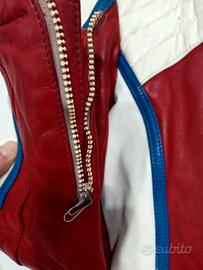 Splendido giubbotto da moto originale anni '80/'90 firmato Futura. Un pezzo iconico in vera pelle, perfetto per amanti del genere Café Racer o per un look street vintage ricercato. Condizioni: Ottime condizioni vintage. La pelle è robusta e i colori (rosso, blu e bianco) sono ancora molto vivaci. Presenta lievi e normali segni del tempo che ne accentuano il carattere autentico. Le cerniere sono funzionanti ma mancanti dell' appendice (vedere foto). Taglia: XS/S Stile: Perfetto per chi guida moto classiche, custom o semplicemente come capo d'abbigliamento vintage di alta qualità.