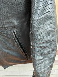 i segni di usura sono semplicemente quelli che vedete in foto, protezioni non removibili su spalle e gomiti morbide, possibilità di inserire un paraschiena all'interno dell'imbottitura