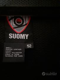 Giubbotto in pelle Suomy per moto, con un design sportivo. - Inserti rossi e bianchi. - Logo Suomy sul fondo. - Taglia 52.