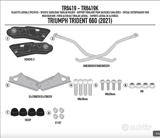 Vendo telaietti laterali GIVI TR6419 con sistema REMOVE-X a sgancio rapido, compatibili esclusivamente con Triumph Trident 660 anni 2021-2022.