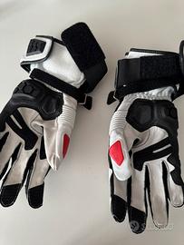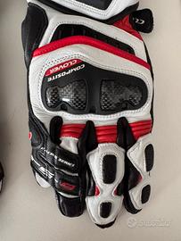 Clover guanto pista uomo RS-9 - Bianco/Rosso DPI : Dispositivo di Protezione Individuale Certificazione CE: EN 13594: 2015 Categoria di certificazione CE: Livello "1 KP" Dorso:Pelle ovina Palmo:Pelle di Canguro + rinforzi in Microfibra Scudo protettivo in TPR+Carbonio su nocche Scudo protettivo in TPR su palmo Doppio scudo protettivo in TPR su laterale polso Scudo protettivo in TPR ventilato su dorso guanto Scudo protettivo in TPR su mignolo Imbottiture protettive su palmo guanto e dita Palmo rinforzato in Microfibra Doppie cuciture sulle zone più esposte Connessione mignoloanulare Doppio cinturino di chiusura Chiusura a doppio flap elasticizzato su polso soffietto elasticizzato di espansione su laterale guanto soffietti elasticizzati su dita soffietto elasticizzato su pollice Ventilazione canalizzata su nocche Polso elasticizzato Cuciture esterne su dita Silicone anti-scivolo su palmo, dito indice e medio taglia S