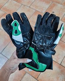 Guanti da moto con design sportivo e protezioni. - Colore verde, nero e bianco. - Materiale in pelle e tessuto. - Logo WINNET visibile.