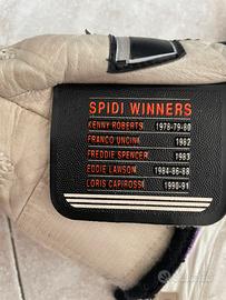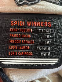 "SPIDI WINNERS" e elencano nomi di piloti di motociclismo come Kenny Roberts, Freddie _Spencer, Eddie Lawson e Loris Capirossi, con gli anni delle loro vittorie, suggerendo un legame con la storia delle corse motociclistiche.