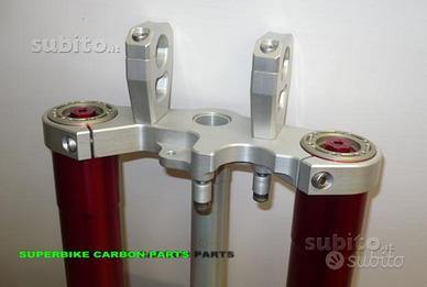AVANTRENO SPECIALE CON FORCELLE MARZOCCHI E PINZE BREMBO PER GUZZI 1200 SPORT E BREVA. Progettiamo e Realizziamo avantreni speciali per qualsiasi moto comprese special e prototipi.Con il nostro kit potete modificare e/o sostituire l'avantreno della vostra moto e renderla unica. Il kit e' costituito da forcelle OHLINS (disponibili anche forcelle MARZOCCHI), piastre di sterzo speciali ricavate dal pieno, piedini forcella attacco radiale ricavati dal pieno, raiser manubrio in caso di naked oppure semimanubri in caso di moto sportive, pinze freno Brembo ad attacco radiale complete di pastiglie, staffe parafango e parafango in carbonio con perno ruota boccole e distanziali. Progettiamo e realiziamo un avantreno completo di tutte le parti. Le forcelle sono appositamente modificate nell'interasse e nell'idraulica per essere perfettamente compatibili con il tipo di moto. Potete utilizzare qualsiasi cerchi e dischi freno anteriori. Il kit può essere realizzato sia per pinze radiali sia per pinze ad attacco assiale (di cui sono dotate le moto più vecchiotte) o perimetrale (vedi Buell o alcune Harley Devidson). I nostri kit avantreni speciali si montano senza alcun problema e senza dover effettuare alcun adattamento. Tutte le parti ricavate dal pieno le possiamo anodizzare di qualsiasi colore . Anche la forma delle piastre di sterzo possono essere realizzati appositamente su specifiche del cliente. Per il montaggio delle piastre di sterzo si utilizzano boccole e cuscinetti originali. Possiamo realizzare cave di alleggerimento passanti sia sulla piastra di sterzo superiore che inferiore. Predisposizione attacco blocchetto accensione se necessario e attacco ammortizzatore di sterzo eventualmente.. Per ogni moto sviluppiamo un progetto dedicato in base alle vostre esigenze.