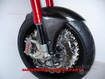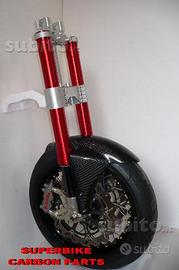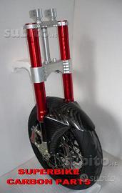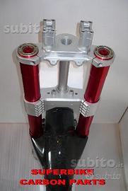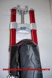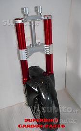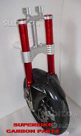 Kit costituito da: piastre di sterzo speciali ricavate dal pieno, raiser manubrio ricavati dal pieno, forcelle MARZOCCHI RAC 50, pinze radiali Brembo m4, perno ruota, kit staffe parafango ricavate dal pieno, parafango carbonio, perno ruota, boccole.