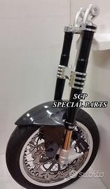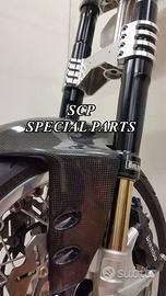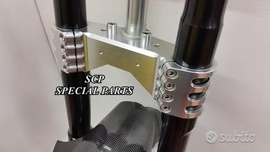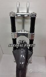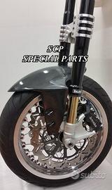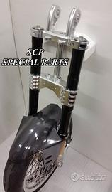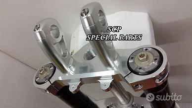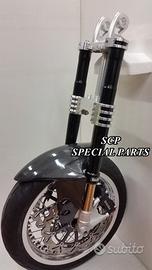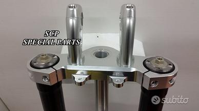 PROTOTIPIAMO E REALIZZIAMO AVANTRENI SPECIALI SU MISURA PER QUALSIASI MOTO. PRESENTIAMO AVANTRENO COMPLETO PER GUZZI GRISO 1200 CON FORCELLE OHLINS NIX 30, PIASTRE DI STERZO SPECIALI RICAVATE DAL PIENO, PIEDINI FORCELLA RADIALI RICAVATI DA PIENO, PARAFANGO IN CARBONIO. IL KIT E' PLUG AND PLAY! SPECIFICO! SI MONTA SENZA NESSUNA MODIFICA CON TUTTE LE PARTI ORIGINALI. OPPURE COME OPTIONAL POSSIAMO FORNIRE : IMPIANTO FRENANTE BREMBO (PINZE DISCHI POMPA), CERCHI A RAGGI, CERCHI IN LEGA, CERCHI IN CARBONIO. Kit costituito da: Forcelle OHLINS NIX 30 TOP DI GAMMA REALIZZATE SPECIFICATAMENTE NELLA TARATURA per GUZZI GRISO. Le forcelle sono corredate da piedini radiali CNC. Le piastre di sterzo speciali ricavate dal pieno e sovradimensionate con piastra inferiore da 80 mm a 4 punti con cave di alleggerimento passanti. Piastra di sterzo superiore alleggerita con cave passanti e alloggi per Riser naked. Semimanubri ricavati dal pieno optional. Staffe parafango ricavate dal pieno con parafango in carbonio e kit perno ruota ricavato dal pieno. Per il montaggio si utilizzano boccole e cuscinetti originali. Il cerchio e l'impianto freni può essere mantenuto originale (purchè con pinze radiali). Oppure si puo attingere ai nostri optional. Possiamo progettare e realizzare qualsiasi specifica atta a rendere unica tale tipologia di prodotto. Tutte le parti ricavate dal pieno possono essere progettate e realizzate direttamente su specifiche tecniche ed estetiche del cliente. Sulle piastre possiamo replicare attacchi e supporti originali per telaietto, quadro strumenti, blocco accensione, blocca sterzo, ammortizzatore di sterzo etc oppure possiamo farne di nuovi su richiesta. Progettiamo e Realizziamo avantreni speciali completi con forcelle ohlins per: cafe racer, scrambler, streetfighter, superbike, prototipi, show bike, maxi enduro, off road, special etc...