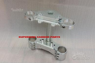 GUZZI GRISO - PIASTRE DI STERZO SPECIALI RICAVATE DAL PIENO PER TRASFORMAZIONE CON SEMIMANUBRI Il kit piastre è costituito da piastra di sterzo inferiore con asse canotto e piastra di sterzo superiore. Sovradimensionate con inferiore da 60 mm a 3 punti di chiusura oppure disponibile da 80 mm a 4 punti di chiusura. La superiore è ditata di una speciale lavorazione in modo da poter utilizzare indifferentemente sia i riser che i semimanubri sportivi. Per il montaggio si utilizzano boccole e cuscinetti originali. Sono plug & play, si montano senza modifiche. Possiamo realizzare cave di alleggerimento anche passanti e altre lavorazioni meccaniche su richiesta. Un prodotto rivoluzionario per efficacia, risorse tecniche e costo contenuto. Possibilità di scegliere qualsiasi colore per l'anodizzazione. Le piastre di sterzo sono progettate appositamente per migliorare il feeling con l'avantreno eliminando il chattering rendendo la moto piu' stabile in inserimento curva e percorrenza. La lega speciale utilizzata è testata in pista nei principali campionati internazionali e studiata appositamente per assorbire le sollecitazioni e permettere alle sospensioni di lavorare molto meglio. Realizzate con Off set standard oppure speciale o regolabile a richiesta. Replichiamo attacchi e supporti originali per telaietto, quadro strumenti, blocco accensione, blocca sterzo, ammortizzatore di sterzo etc... oppure ne produciamo su richiesta. Il cliente può scegliere qualsiasi tipologia, forma e lavorazione meccanica o estetica per il progetto delle piastre di sterzo entro i limiti imposti dalla quote della moto stessa, prendendo spunto dai nostri lavori precedentemente effettuati. Finitura superficiale e anodizzazione di qualsiai colore. Progettiamo e produciamo piastre anche per realizzazioni speciali e sostituzioni forcelle originali con altre aftermarket.