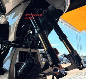 FORCELLA UP SIDE DOWN OHLINS Steli da 43 mm trattati al tin Piedino ricavato dal pieno con attacco pinza radiale Regolabile in compressione Ed estensione E precarico delle molle Cartuccia interna NIX con pistoni da 30mm