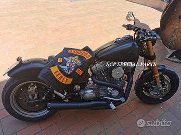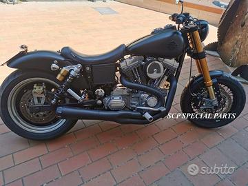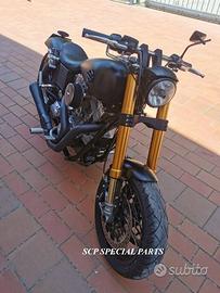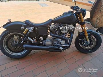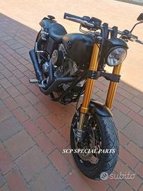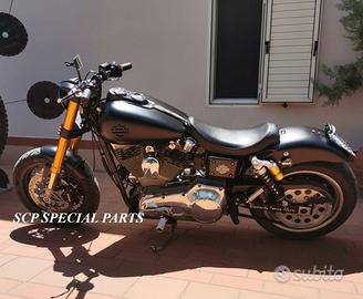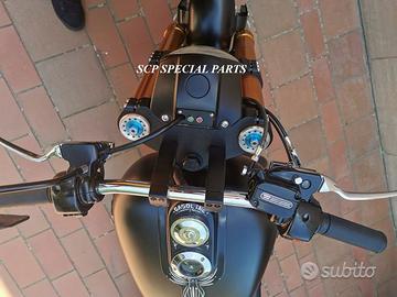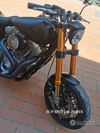 Progettiamo e Realizziamo avantreni speciali con forcelle ohlins e freni brembo, su misura per: harley, cafe racer, scrambler, custom, streetfighter, superbike, prototipi, showbike, maxi enduro, off road, maxi scooter, brat. ESCLUSIVITA', PERFORMANCE, SICUREZZA ED ESTETICA AL TOP! PRESENTIAMO AVANTRENO SU MISURA PER HARLEY DAVIDSON DYNA ( su richiesta anche per qualsiasi altro modello), costituito da: - FORCELLE OHLINS a stelo rovesciato, allestite su misura in base al progetto. Disponibili vari modelli :Ohlins NIX SUPERBIKE, Ohlins R&T oppure Ohlins a stelo tradizionale versione retrò. - PIEDINI FORCELLE RADIALI - KIT PIASTRE DI STERZO CNC RICAVATE DA PIENO SU MISURA - STAFFE CNC, supporti faro e cruscotto - RISER CNC manubrio naked oppure COPPIA SEMIMANUBRI CNC - PINZE BREMBO RADIALI (vari mod. disp.) - DISCHI BREMBO da 320mm - STEFFE PARAFANGO RICAVATE DAL PIENO - PERNO RUOTA RICAVATO DA PIENO Optional: - COPPIA CERCHI RAGGI CNC - AMMORTIZZATORI POST. OHLINS - PIEDINI RADIALI CNC RICAVATI DA PIENO IL KIT MONTA PLUG AND PLAY SENZA MODIFICHE POSSIAMO PRODURLO PER IL CERCHIO ORIGINALE OPPURE PER CERCHIO SPECIALE. KIT SIA X DOPPIO DISCO CHE MONO DISCO. Piastre di sterzo speciali ricavate dal pieno con piastra inferiore da 60mm di spessore, 3 punti di chiusura e piastra superiore con riser. Possiamo realizzare anche piastre ulteriormente maggiorate, fino a 95mm a 4 o 5 punti di chiusura Per il montaggio delle piastre si utilizzano boccole e cuscinetti originali. Tutte le parti ricavate dal pieno possono essere anodizzate di qualsiasi colore. Le forcelle ohlins possono essere fornite con fodero anodizzato di qualsiasi colore. Possiamo progettare e realizzare qualsiasi modifica su richiesta. Sulle piastre possiamo replicare attacchi e supporti presenti sul modello originale per telaietto, quadro strumenti, blocco accensione, blocca sterzo, ammortizzatore di sterzo, fari, oppure possiamo real