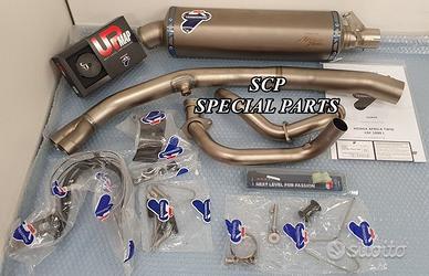 HONDA AFRICA TWIN 2016- 2017 HONDA AFRICA TWIN 2018 - 2020 SCARICO COMPLETO TERMIGNONI TUTTO IN TITANIO CORREDATO DI CENTRALINA UP MAP TERMIGNONI CON MAPPATURA SPECIFICA. SCARICO CONMPLETO COSTITUITO DA TERMINALE OMOLOGATO IN TITANIO E COLLETTORI COMPLETI IN TITANIO Dalla collaborazione di Termignoni con il Team HRC prende spunto la realizzazione dello scarico dedicato alla Honda CRF 1000 L Africa Twin . Il silenziatore omologato EURO 4, è caratterizzato da una camicia realizzata in Titanio con lo storico logo metallico rivettato. A corredo del kit è stato progettato anche il paracalore in fibra di Carbonio per rendere ancora più unica la tua Honda. Per soddisfare le esigenze di elevate prestazioni dai proprietari della nuova Africa Twin CRF1000L, sono disponibili i collettori racing sviluppati dalla Termignoni in collaborazione con Honda. Realizzati interamente in titanio. Questa combinazione offre un'importante riduzione di peso PARI 4 chilogrammi ed un costante incremento di potenza DI BEN 7 CV!!!