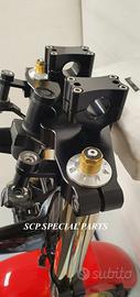 Piastre di sterzo speciali ricavate dal pieno con piastra inferiore a 2 punti di chiusura e piastra superiore con riser.