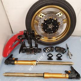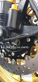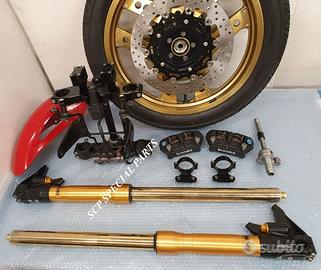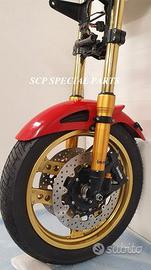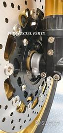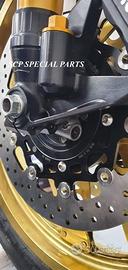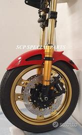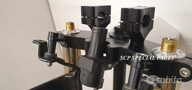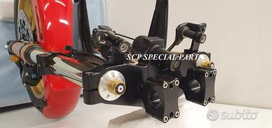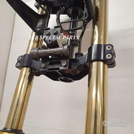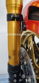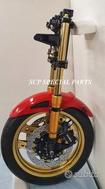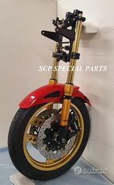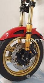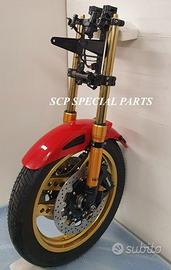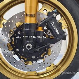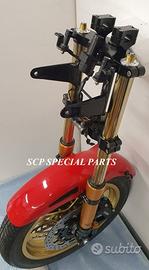 Progettiamo e Realizziamo avantreni speciali con forcelle ohlins e freni brembo, su misura per: cafe racer, scrambler, custom, streetfighter, superbike, prototipi, show bike, maxi enduro, off road, maxi scooter, brat. ESCLUSIVITA', PERFORMANCE, SICUREZZA ED ESTETICA AL TOP! PRESENTIAMO AVANTRENO SU MISURA PER HONDA CB 900 F BOL D'OR BOL DOR ( su richiesta anche per qualsiasi altro modello), costituito da: - FORCELLE OHLINS CONVENTIONAL allestite su misura in base al progetto, modello TRADIZIONALE con stelo da 43mm (disponibili su richiesta anche OHLINS ROVESCIATE NIX SUPERBIKE oppure OHLINS ROVESCIATE R&T) - PIEDINI FORCELLE RADIALI ricavati dal pieno - KIT PIASTRE DI STERZO RICAVATE DAL PIENO SU MISURA - STAFFE SUPPORTO TELAIETTO FRONTALE ORIGINALE RICAVATE DAL PIENO - RISER OPPURE COPPIA SEMIMANUBRI RICAVATI DAL PIENO - PINZE BREMBO RADIALI (vari mod. disp.) - DISCHI BREMBO da 320mm - STEFFE PARAFANGO RICAVATE DAL PIENO - FLANGE MOZZO RICAVATE PIENO PER MANTENERE LA CHIOCCIOLA CONTA CHILOMETRI ORIGINALE - PERNO RUOTA RICAVATO DA PIENO Optional: - COPPIA CERCHI RAGGI CNC - AMMORTIZZATORI POST. OHLINS IL KIT MONTA PLUG AND PLAY SENZA MODIFICHE CON IL CERCHIO ORIGINALE HONDA. SI MANTIENE IL TELAIETTO ANTERIORE ORIGINALE E LA CHIOCCIOLA CONTACHILOMETRI ORIGINALE. Piastre di sterzo speciali ricavate dal pieno con piastra inferiore a 2 punti di chiusura e piastra superiore con riser. Per il montaggio delle piastre si utilizzano boccole e cuscinetti originali. Tutte le parti ricavate dal pieno possono essere anodizzate di qualsiasi colore. Le forcelle ohlins possono essere fornite con fodero anodizzato oro oppure anodizzato nero. Possiamo progettare e realizzare qualsiasi modifica su richiesta. Sulle piastre possiamo replicare attacchi e supporti presenti sul modello originale per telaietto, quadro strumenti, blocco accensione, blocca sterzo, ammortizzatore di sterzo, fari, oppure possiamo realizzare atta